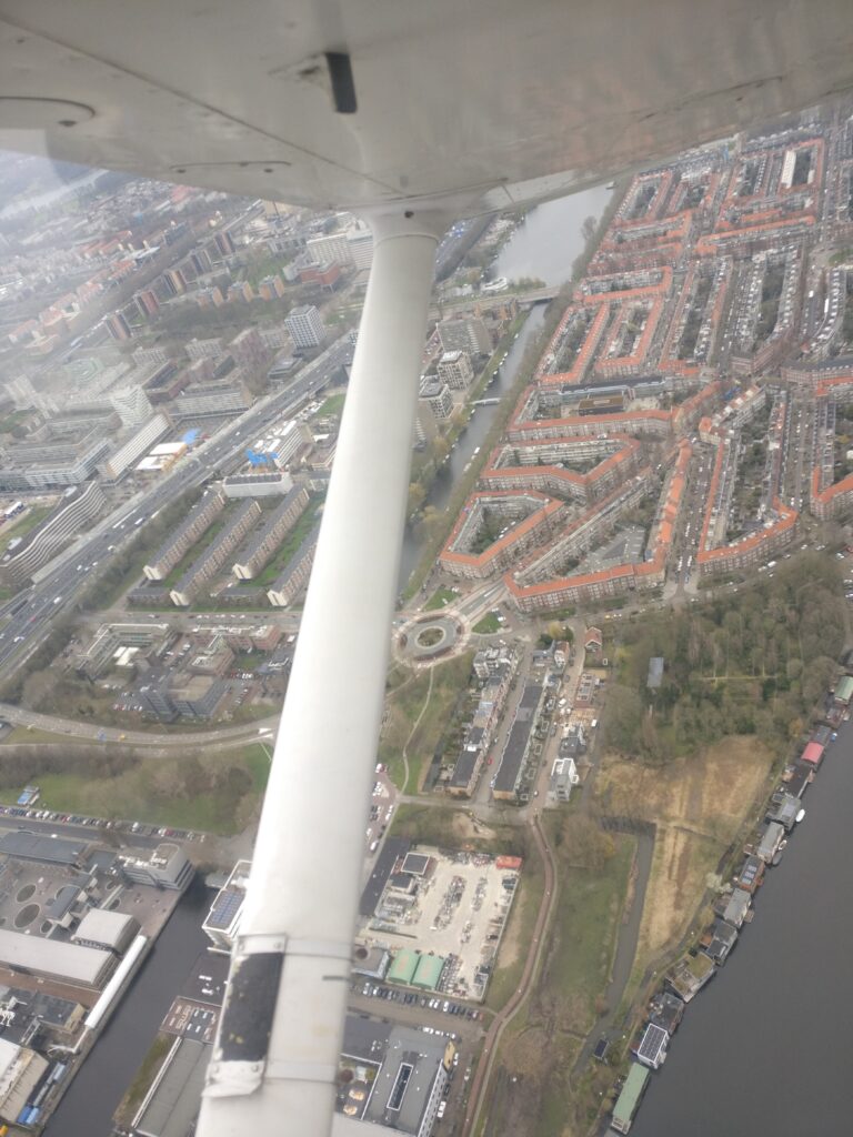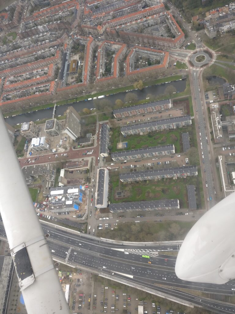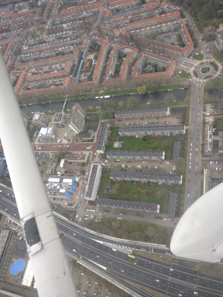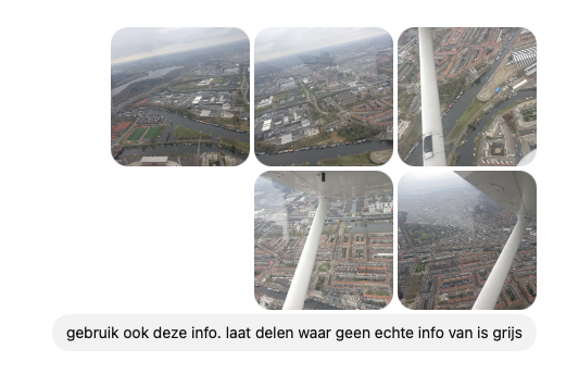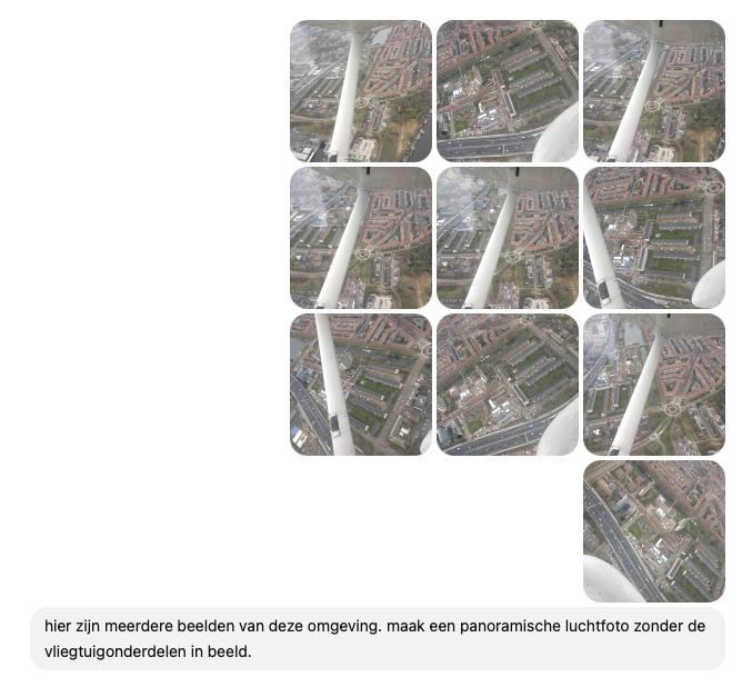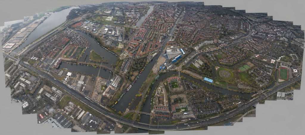 Een paar jaar terug vlogen wij voor de lol een rondje Amsterdam en daar had ik nog wat fotos van. Zou het niet mooi zijn als ik met ChatGPT deze kan stitchen tot een panorama van Amsterdam Zuid, Hoofddorplein en het Schinkelgebied bij het Olympisch Stadion?